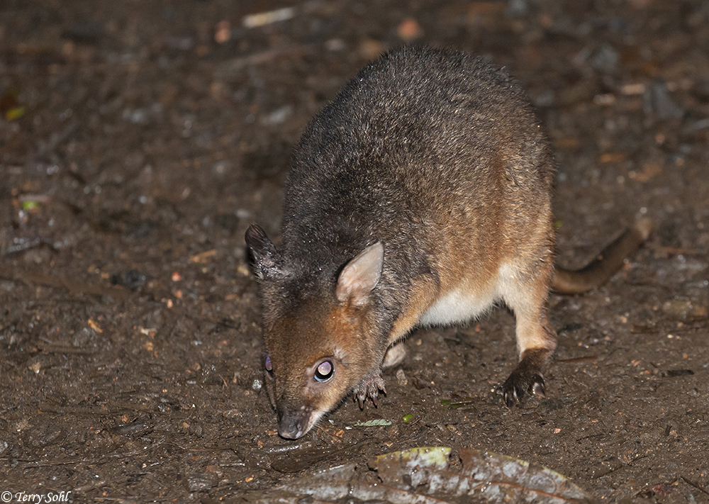 I don't know much about all the different kinds of kangaroos, wallabies, and other marsupial critters in Australia. I admit before arriving I hadn't ever heard of a "Pademelon". However, this is one critter we saw a lot of, while staying at the Rainforest Canopy Treehouses near Tarzali. They were always around our treehouse, day and night, but were pretty shy. During the day one would occasionally come by, but would be hiding at the edge of the clearing. At night they were more brave, presumably cleaning up any fallen fruit or seeds from our feeding the birds and possums.