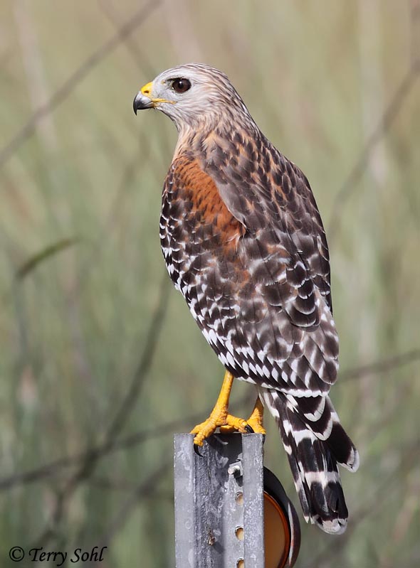 | Overall: The smallest of the Buteos, but still possibly confused with other Buteos on this page. They are most likely to be confused with the Red-shouldered Hawk, another smallish Buteo species. Has both light- and dark-color morphs, but the dark color morph is typically only found in the western part of its range and is quite rare. | Overall: Red-shouldered Hawks lack the more obvious plumage difference of "light" and "dark" morph birds of other Buteo species, but still exhibit considerable variation in plumage. Overall plumage patterns are similar across their range, but California birds exhibit much richer coloration, while some populations in Florida are much paler. The photo above represents the more pale extreme of a Red-shouldered Hawk, particularly the light-colored head. | |