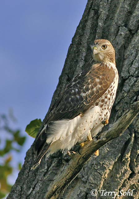 | Body: Many color morphs have lighter undersides with a "belly band" of spots and streaks (see photo above for example of the belly band). Dark morph birds can be nearly all dark on the underside. A rufous-morph bird has a dark underside with a rufous-colored upper chest. | Body: Variable depending upon color morph. Light morph (shown in photo above) has white underparts with a darker rufous-colored bib on the upper chest. Intermediate morph birds has extensive rufous on lower parts. Dark-morph birds are dark brownish on all of the underbody, some with a hint of very dark rufous tones. Juvenile birds have similar color patterns faithful to the color morph, but typically with substantial streaking and spots instead of solid colors on the underparts. | |