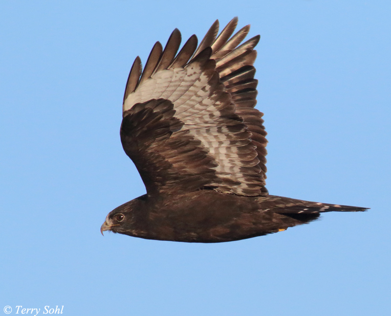 | Wings (upperside): Darker coverts contrast with lighter-colored flight feathers on both light and dark-morph birds. White on the inner primaries is particularly obvious with a fully spread wing in flight. | Wings (upperside): Dark overall, but light-morph birds may show some subtle lighter spotting. | |