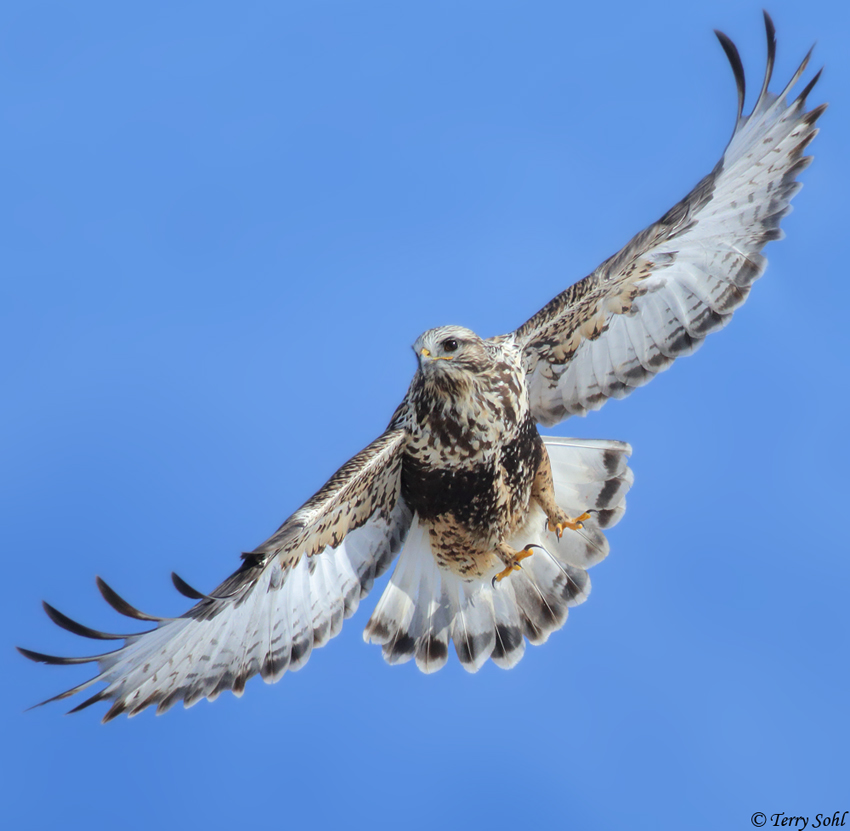 | Overall: Ferruginous Hawks are the largest of the Buteos, and well named (Buteo regalis). They have two typical color morphs, a light (shown above) and a dark. Light color morphs are by far the most common. Differences between juvenile and adult birds are somewhat less substantial than for most other Buteos. The term "ferruginous" refers to the warm rusty reddish colors often found on the shoulder and leg feathers of light-morph birds. Photos of multiple color morphs are found at the bottom of the page. | Overall: Two color morphs of Rough-legged Hawks are typically found, a light morph (shown above) and a dark morph that has very dark overall plumage. The term "rough-legged" refers to the fully feathered legs, similar to a Ferruginous Hawk. Photos of multiple color morphs are found at the bottom of the page. | |