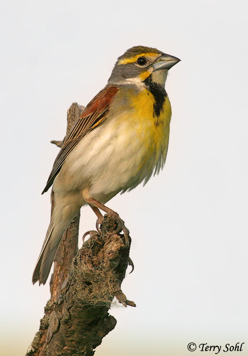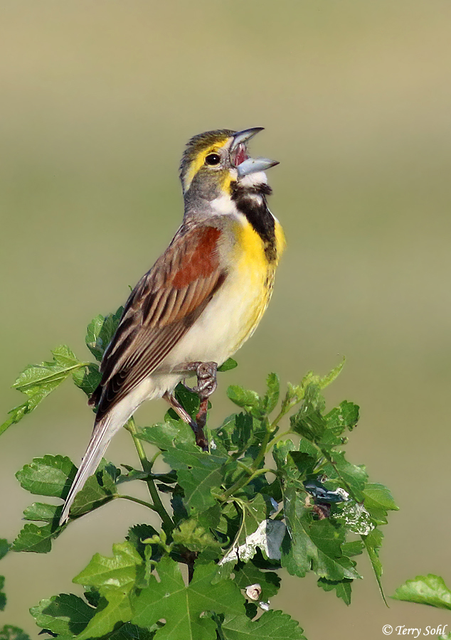 Dickcissels are a vocal summer resident in the state, especially in the eastern part, where they can often be found singing their distinctive song from fenceposts, wires, and plant tops. With their yellow chest and black "bib", they share a general resemblance to the much larger Meadowlark. They seem to vary locally quite a bit from year to year, presumably in response to vegetation condition and other habitat parameters. Several birds may utilize the same field or grassy area during the summer breeding season, but the most frequent sighting of a Dickcissel in South Dakota is of a single bird (often a vocalizing male). However, during the winter months, Dickcissels may form massive flocks numbering in the thousands.