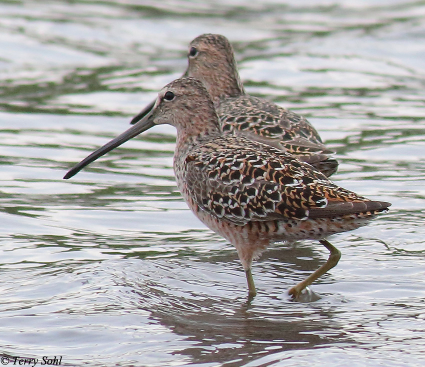 Very similar to its close relative, the Short-billed Dowitcher, with only a slightly longer bill. Major differences lie in their different voices and their habitat preference, as the Long-billed Dowitcher prefers freshwater, while the Short-billed Dowitcher is more often found in saltwater. The photo at the right shows a breeding plumage bird. Photos below also show a winter-plumaged bird.