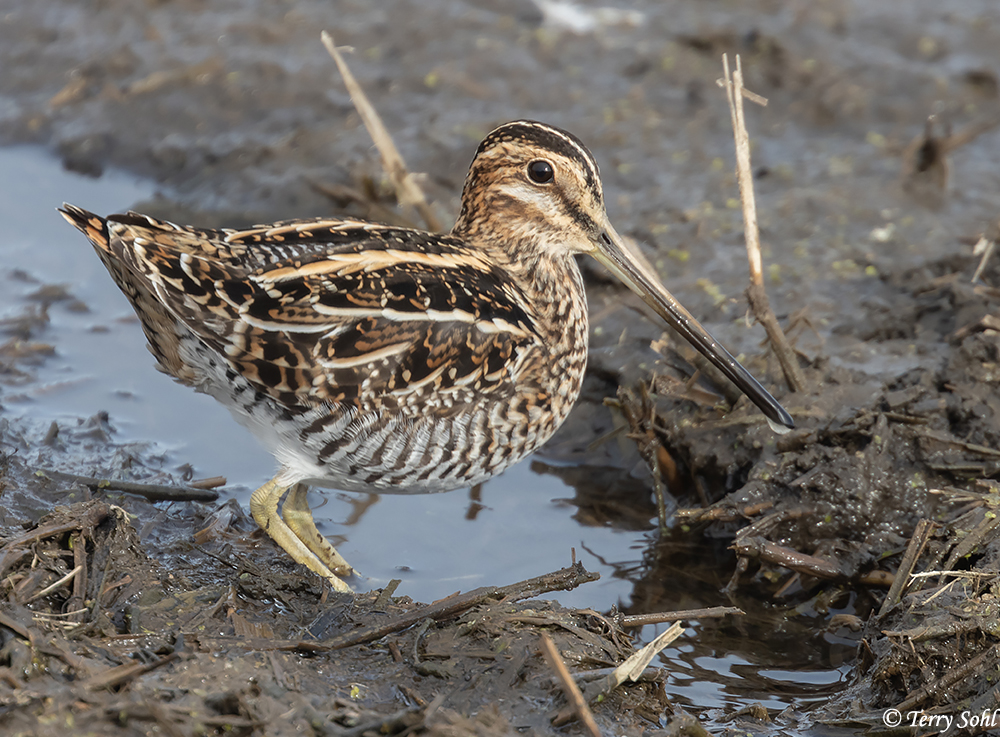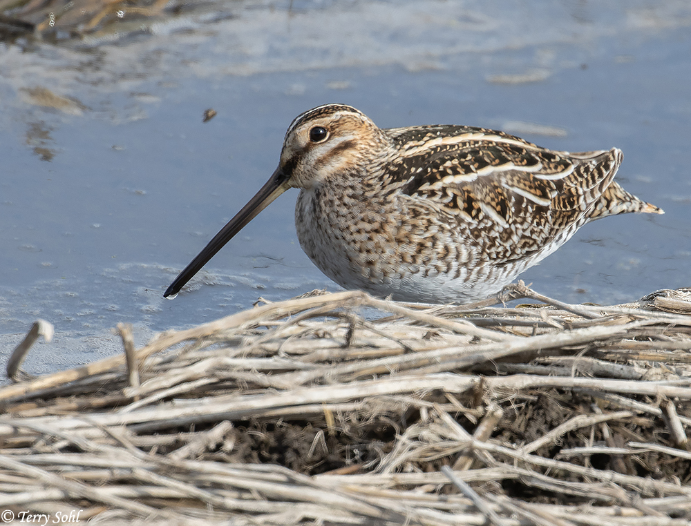 - Wilson's Snipe - Wilson's Snipe are a common migrant and summer resident in South Dakota. They share the same stocky build and long bill of a Long-billed Dowitcher. Plumage is substantially different, particularly in breeding plumage when the Long-billed Dowitcher has rich ruddy colors on the underparts, compared to the whiter belly on a Wilson's Snipe. Wilson's Snipe also have a stronger facial pattern with apparent stripes, and an eye that seems larger in proportion to the head than a Long-billed Dowitcher.