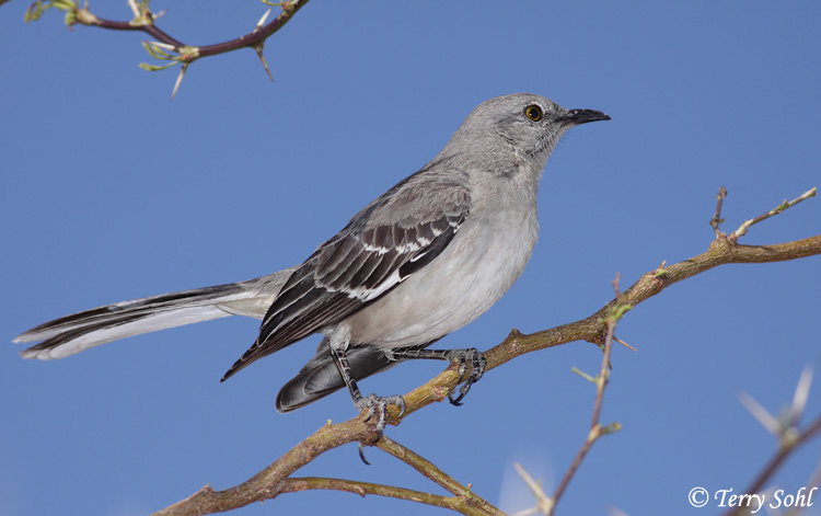 One of the ultimate imitators, the Northern Mockingbird is able to imitate not only the songs of many species of birds, but may sometimes repeat other sounds from the meow of a cat to the tinkle of wind chimes. The Northern Mockingbird is a bold defender of its nest site, attempting to chase away anything (including people) that come too close for its comfort. South Dakota is at the northern edge of its range, although it has been expanding its range to the north in recent decades. They are increasingly rare as one moves northward from the Nebraska/South Dakota border.