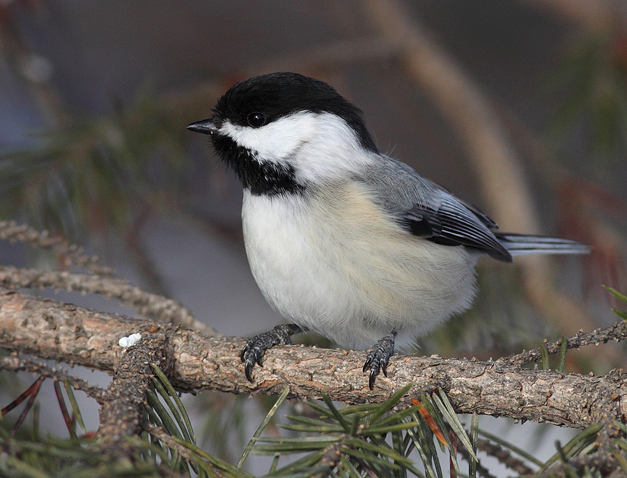 Black-capped Chickadee perched on a spruce tree branch |
