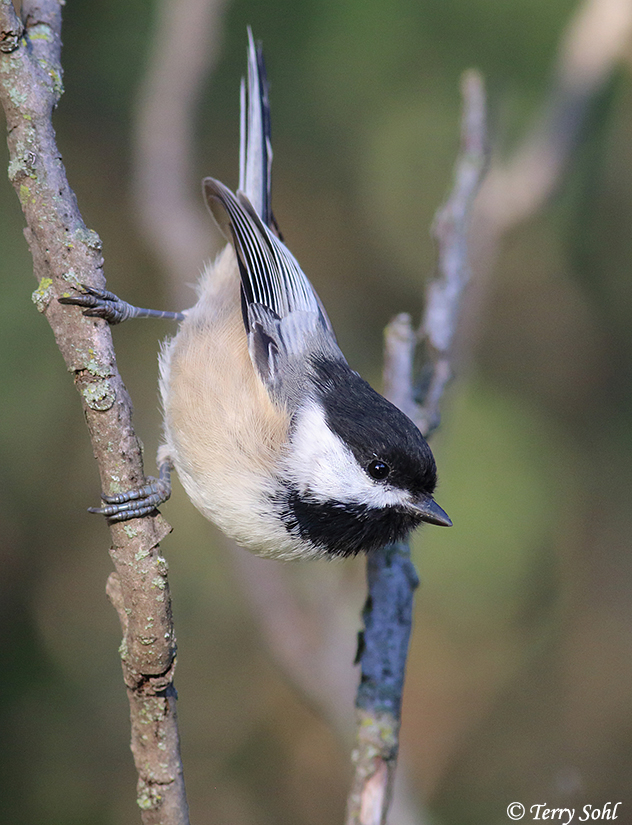 Upside-down Chickadee clinging to a branch |