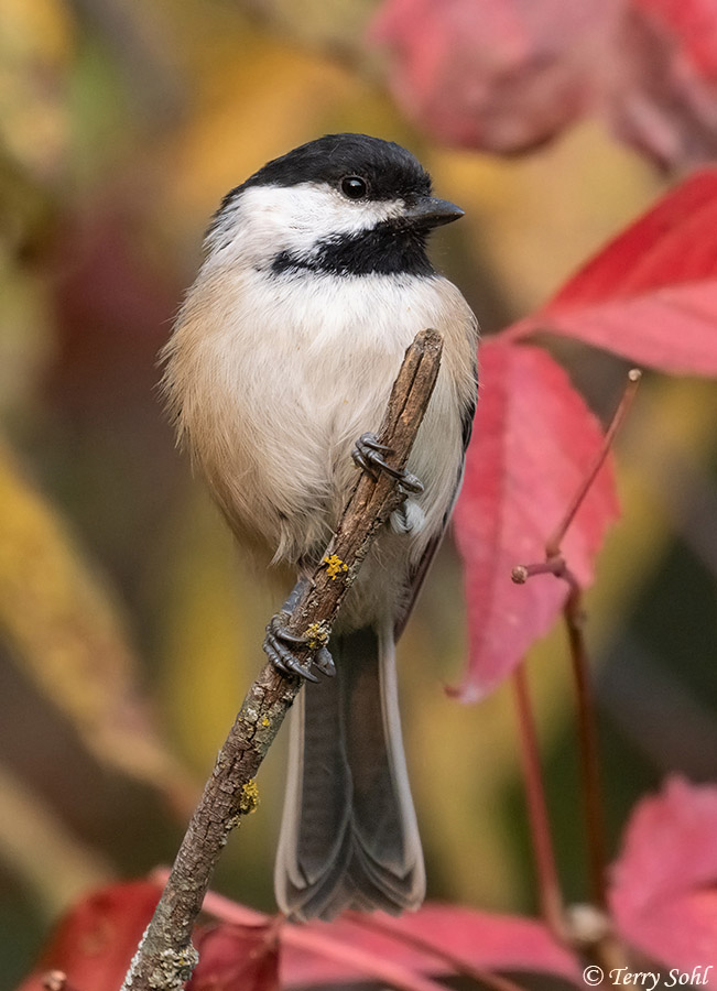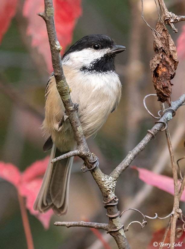 Black-capped Chickadee perched in red autumn foliage |