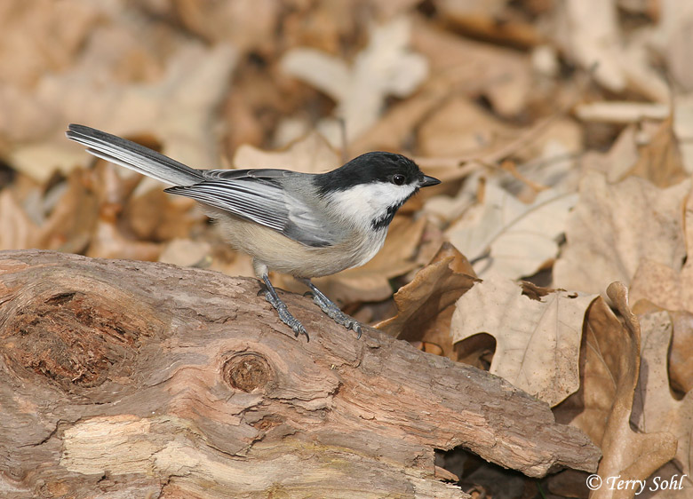 Black-capped Chickadee perched on fallen log in the autumn leaves |